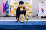A imagem retrata uma mulher ao lado de um grande banner. Ela tem cabelos curtos e cacheados e está vestindo um blazer preto sobre uma blusa preta, calças de cintura alta em cor caramelo e bottons no blazer.