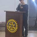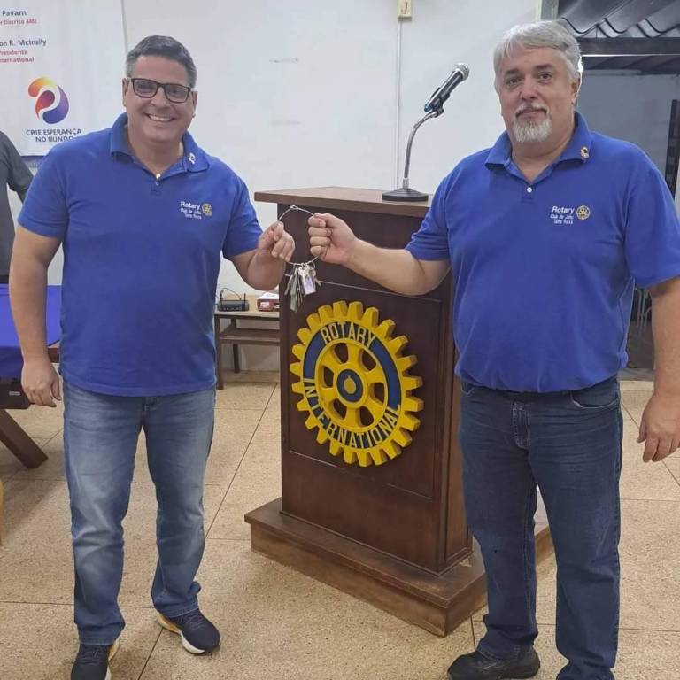 Entre eles, há um púlpito de madeira com um microfone na parte superior direita. No centro do púlpito, está o logotipo do Rotary International, que é uma Roda Rotária amarela com o texto "Rotary International" em azul.