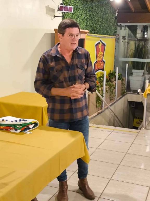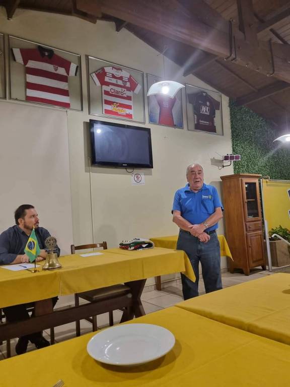 Na foto identificamos 8 homens adultos vestidos de maneira esporte, uns com as mãos nos ombros dos outros e todos perfilados lado a lado. O 4° rapaz da esquerda para a direita tem na mão direita uma pequena bandeira do Brasil e na mão esquerda um sino rotário. Todos estão sorrindo. O lugar é fechado, iluminado, tem parede clara ao fundo com uma grande tv plana ao alto. Na lateral esquerda observamos parte do que parece ser uma mesa com toalha amarela. Do lado direito uma parede verde parecendo ser um gramado natural, trás um móvel de madeira bem atrás dos rapazes. O piso é claro e tem a sombra deles à frente.