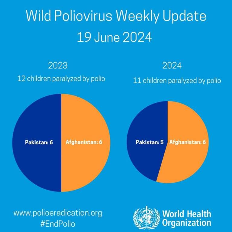 Card em azul céu trás no lado esquerdo um gráfico circular, com o lado esquerdo em azul marinho escrito em branco: Pakistan: 6; e do lado direito em laranja trás os dizeres também em branco: Afganistan: 6. No lado direito um gráfico no mesmo estilo, porém, um pouco menor. No lado esquerdo em azul escuro trás os dizeres em letras brancas: Pakistan: 5. E na mesma esfera menor no lado direito em laranja trás em letras brancas: Afganistan: 6. Centralizado acima em letras brancas: Wild Poliovírus Weekly Update - 19 June 2024