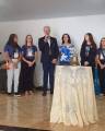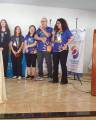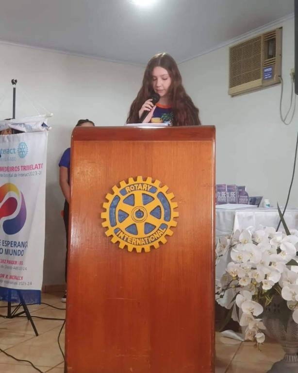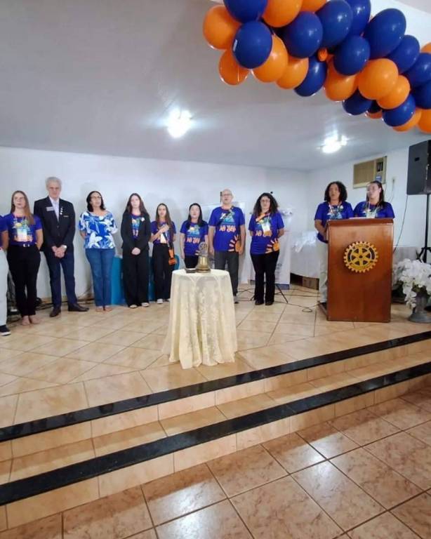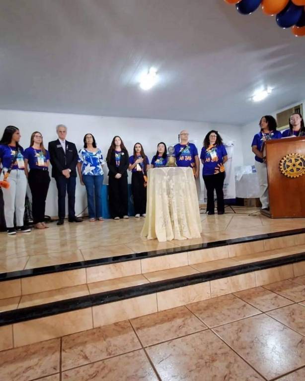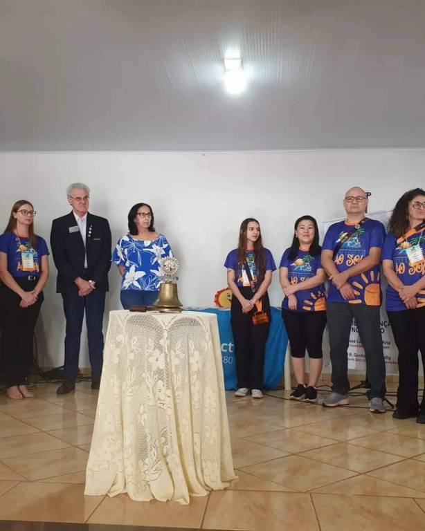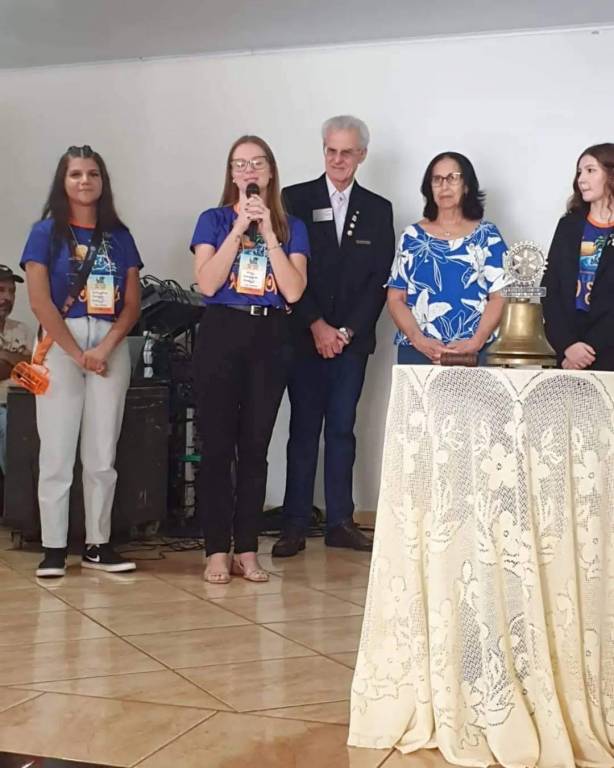 Na foto o casal Gov do Distrito 4480 Pavam e Rita, estão ladeados por 2 adolescentes do lado esquerdo e mais 2 do lado direito, todas vestidas de maneira esporte e usando crachá grande colorido no pescoço. Nosso Gov com certeza está deixando uma mensagem aos ouvintes pois segura um microfone levado à boca com a mão direita. À frente deles uma mesinha redonda com toalha de renda bege comprida, tem em cima um sino rotário com seu martelo de madeira. O lugar é fechado, está iluminado, tem paredes brancas ao fundo e o piso é bege. Alguns utensílios que não são reconhecidos estão encontrados nas paredes ao fundo.