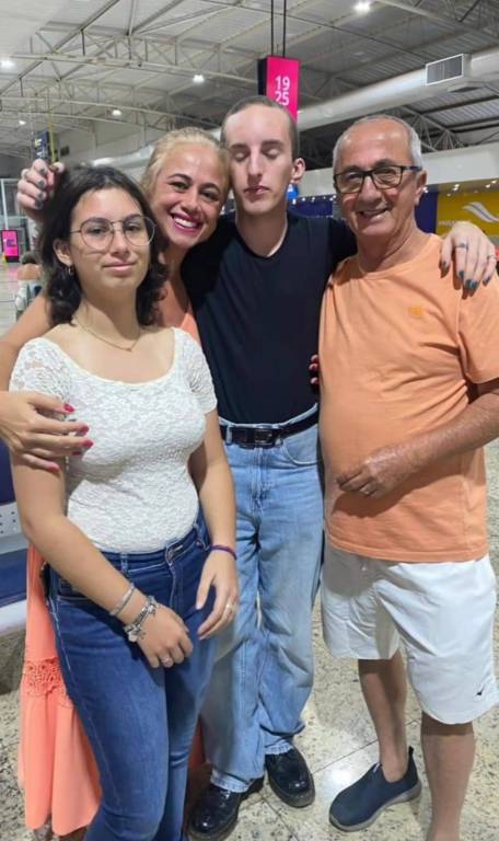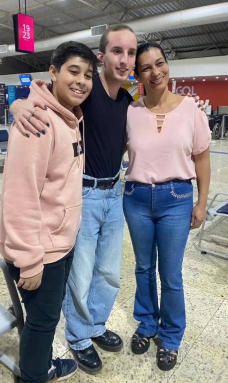 Na foto observamos 3 pessoas, sendo o primeiro a esquerda um jovem sorridente vestindo moletom com capuz na cor bege claro. No meio um jovem sorridente vestindo camiseta e cinto em tom preto e calça jeans em tom claro. Ele está com as mãos sobre o ombro das duas pessoas que estão ao seu lado, como um abraço. Na sua direita uma mulher sorridente vestindo blusa com mangas curtas na cor bege claro e calça jeans. No fundo observamos o saguão de um aeroporto.