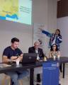 Segue o Gov. Pavam, terno preto, camisa branca, óculos, com a mão direita segura um microfone que está na altura da boca e a mão esquerda aberta na altura da cintura. Sentada, a esposa do Gov. Rita, vestido estampado, óculos. Todos prestando atenção nas palavras do Gov. Ao fundo central, na parede reflete um slide, e no canto direito um banner da gestão do Rotary Club São José do Rio Preto Palácio das Águas. No centro da mesa, na cor azul, um tecido com o logo do Rotary Club de São José do Rio Preto Palácio das Águas.