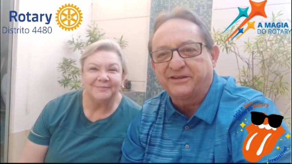 No vídeo observamos um casal simpático, com sorriso farto. A mulher está na esquerda vestindo uma blusa azul, tem cabelos loiros curtos. O homem ao seu lado usa óculos, é calvo e está vestindo uma camiseta de gola polo azul listrada horizontalmente. Acima tem o logo do Rotary Distrito 4480 no lado esquerdo superior e do lado direito superior o logo A Magia do Rotary. Abaixo do lado direito inferior tem um logo Seja o bem vindo ao Rotary Irresistível, escrito ao redor de um desenho de uma lingua laranja com dentes brancos e óculos preto. Um logo feliz. Estão convidando todos para a posse que acontecerá no próximo domingo.