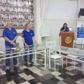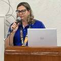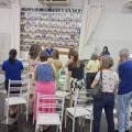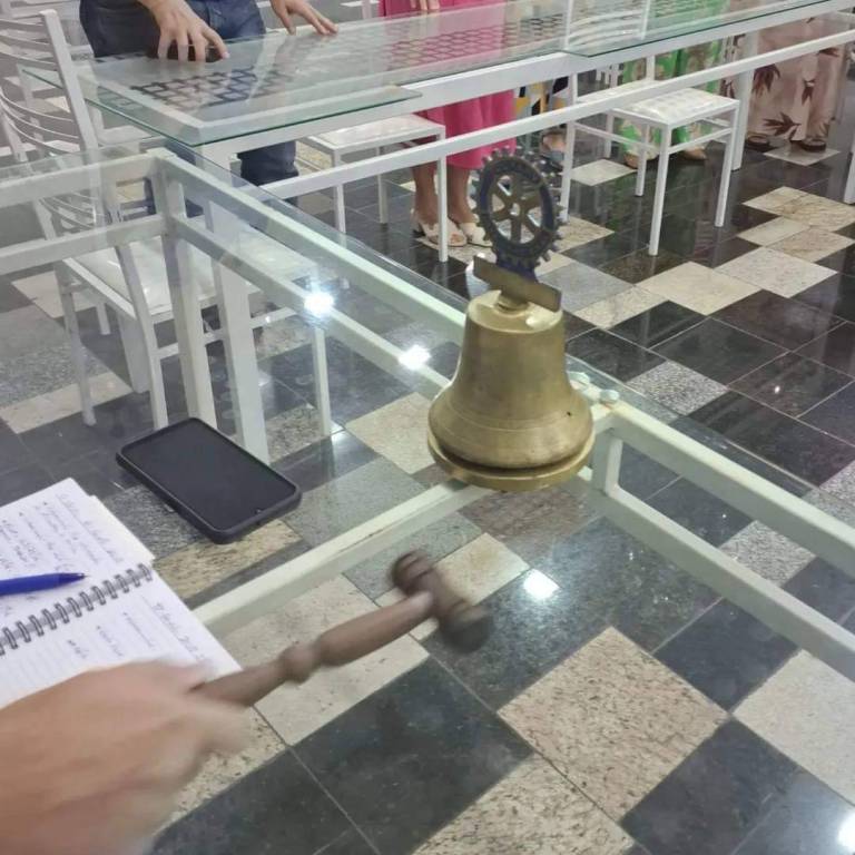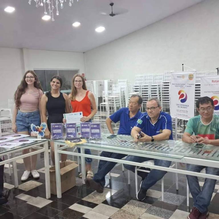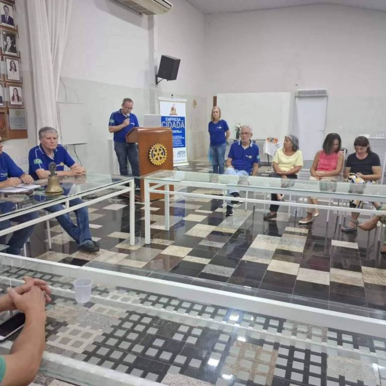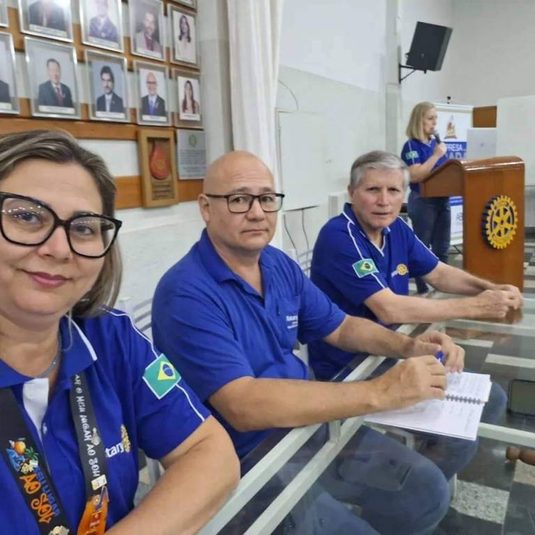 Na foto observamos uma mulher e dois homens sentados em uma mesa e uma mulher de pé usando um microfone na tribuna na direita da mesa. Todos estão vestindo camiseta com gola polo do Rotary Club. No fundo observamos uma parede com fotos de presidentes fixadas em molduras. As paredes tem cores em tons claros e o chão quadriculado com pisos cinza e preto.