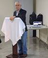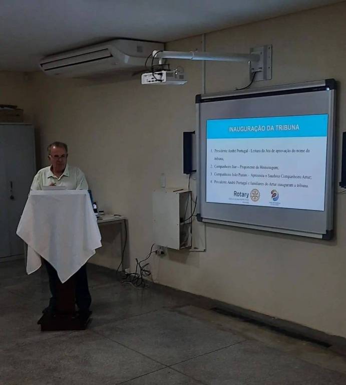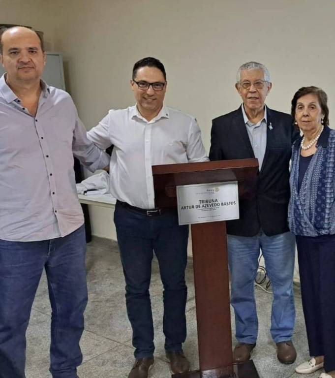 Na foto observamos na lateral direita ocupando metade da foto, o logo do Rotary International e abaixo escrito Rotary Club de, esse material é feito em ferro, tem a cor bronze com fundo da roda rotaria em azul escuro. No fundo e lateral esquerda a foto está desfocada com tres homens e uma mulher. Todos estão de pé atrás da tribuna. Ao lado temos um telão para projeção. Do lado esquerdo temos uma mesa em tom claro e cadeiras e duas cadeiras em tom escuro.