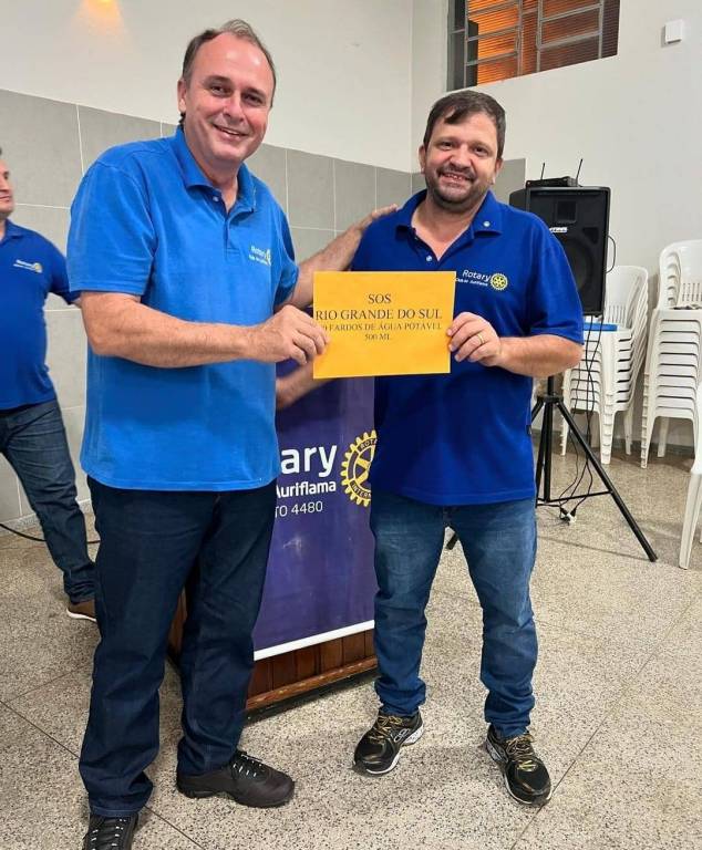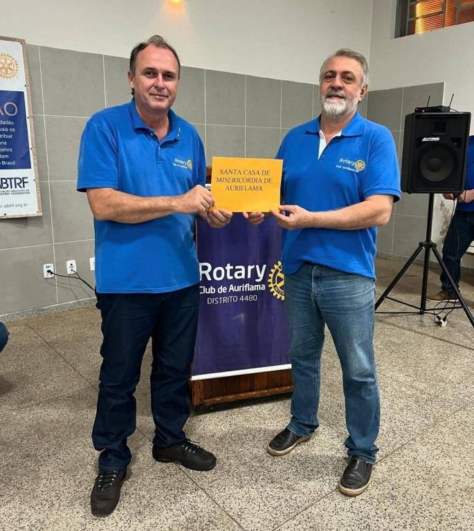 Na foto observamos dois homens de pé, segurando um envelope na cor amarelo escuro escrito Santa Casa de Misericórdia de Auriflama. Eles estão vestindo camiseta de gola polo azul escuro com logo do Rotary Club de Auriflama, calça jeans e calçados em tom escuro. Estão posicionados na frente de uma tribuna identificada com o logo do Rotary Club de Auriflama Distrito 4480, onde observamos do lado direito uma caixa de som sobre um suporte de ferro, do lado esquerdo um pedaço do banner de clube cidadão. No fundo temos uma parede revestida de azulejos em tom cinza e no chão pisos chapiscados em tom cinza.