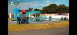 Na foto observamos, da esquerda para a direita, um homem com óculos de sol, camisa branca com manga comprida e calça na cor beje escuro, um homem vestindo um blazer azul marinho, com camisa clara, calça jeans e calçado em tom terroso e uma mulher com blusa estampada nas cores branco, azul, vermelho e beje claro, vestindo calça jeans e sapato em tom beje escuro. No meio da foto temos uma parede em cor azul com uma placa de alumínio escrito AES Brasil Projeto de Subsídio Corporativo Esporte e Lazer para Todos. Projeto Desenvolvido por Rotary Club de Ouroeste. Do lado direito uma mulher vestindo uma camiseta com gola polo na cor azul escuro e calça em tom escuro e no canto observamos um homem com cabelos grisalhos usando óculos de sol e usando uma camiseta do Rotary na cor azul escuro. Todos estão em um ambiente externo sobre um espaço com grama. Há alguns espaços com pedras próximo de um alambrado, onde tem alguns carros estacionado. O ambiente é arborizado.
