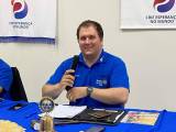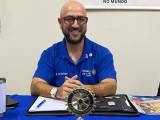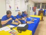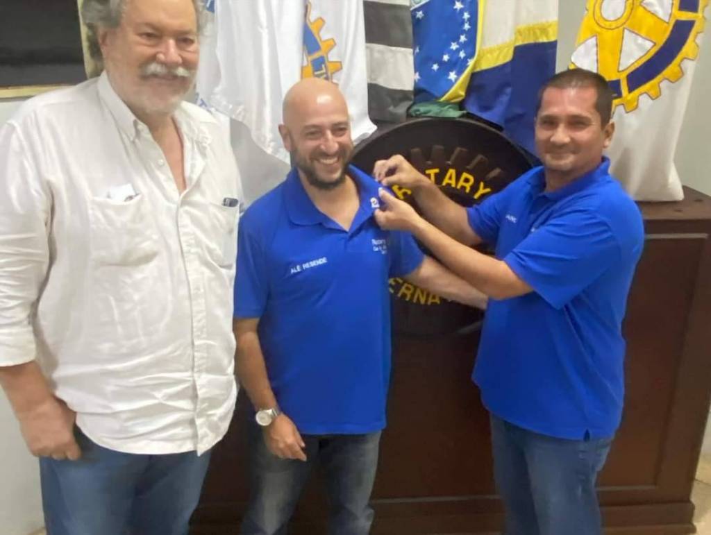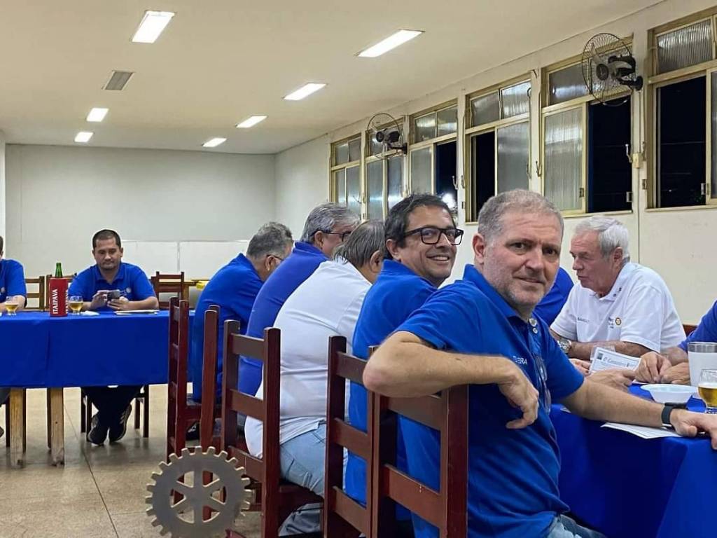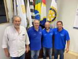 Foto posicionada de lado, trás da esquerda para a direita sentados em cadeiras de madeira um homem calvo, de barba, usando relógio prata de mostrador redondo no braço direito ao lado de outro homem de cabelos escuros que segura um microfone preto na mão esquerda posicionado em direção à boca. Ao lado dele um senhor de cabelos castanhos observa algo em cima da mesa e tem a seu lado um outro homem que aparece parcialmente pois está aguachado do lado do mesmo. Todos vestem camiseta azul do Rotary.