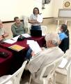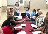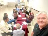 Ao redor de mesas com toalhas na cor vinho, com papéis sobre ela, celular e um notebook encontra: uma mulher em pé, vestindo camiseta listrada de branco com preto, calça jeans, segurando um papel entre as mais; seguindo sentados, três mulheres e cinco homens. Todos prestando atenção na fala da mulher em pé.