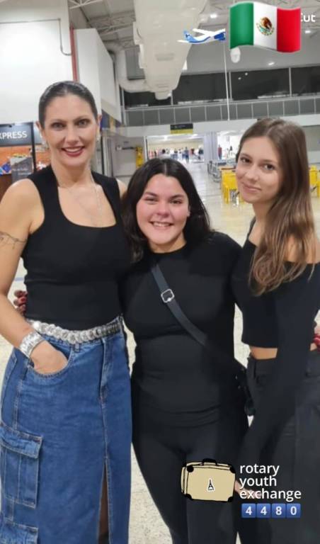 Foto no interior de um aeroporto com um ambiente amplo e fechado, onde observamos 3 jovens garotas. A da esquerda é alta, está maquiada, cabelos escuros presos, usa uma camiseta sem mangas, saia jeans longa, usa um cinto prateado e possui uma delicada tatuagem em seu braço direito. A do centro é a intercambista Camila, está com os longos cabelos escuros soltos, veste roupas pretas e usa uma pequena bolsa preta na cintura com a alça passando pelos ombros. A do lado direito possui cabelos castanhos claros e estão soltos. veste uma camisa preta com manga longa e calça jeans preta. Atrás do grupo é possível ver cadeiras, lojas e uma porta aberta para a área de embarque e desembarque. Na parte superior é possível ver a estrutura metálica de ventilação e o desenho de uma bandeira do México no canto superior direito. No canto inferior direito há o desenho de uma mala com os dizeres Rotary Youth Exchange 4480.