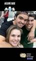 Na foto tres pessoas: uma jovem mulher loira de cabelos longos esta no canto esquerdo sendo abraçada pelo pescoço por um jovem rapaz de camiseta preta usando boné marrom que por sua vez está abraçado também na lateral direita por outro adolescente de camiseta verde musgo. Todos estão sorrindo.