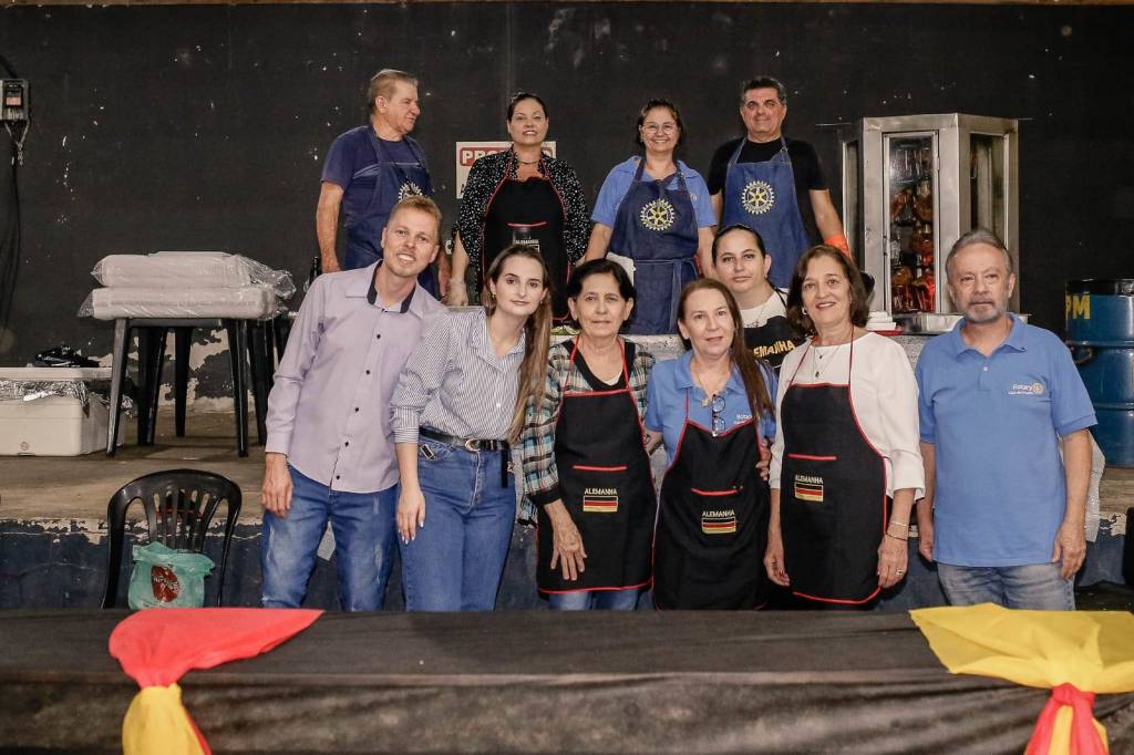 Na foto várias pessoas entre homens e mulheres estão lado a lado. Em cima de um palco atrás temos 2 homens nas pontas com 2 mulheres ao centro, onde um casal que está no lado direito veste avental do Rotary e o outro casal do lado esquerdo um avental preto. Em baixo 4 mulheres no centro tendo 2 homens nas laterais, onde 3 das mulheres usam aventais pretos.