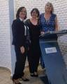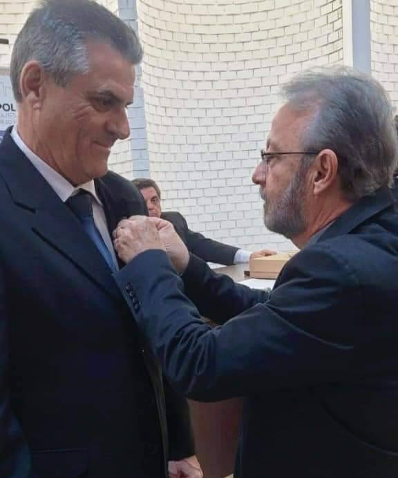 Atrás deles uma mesa onde aparece o Sino do Rotary.