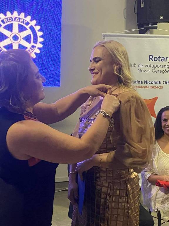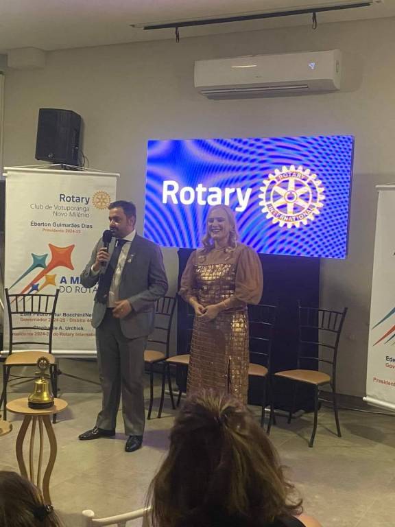 Atrás do casal cinco cadeiras, atrás delas do lado esquerdo o banner nova gestão a magia do Rotary de Votuporanga Novo Milênio, ao fundo um telão azul com o logo grande em branco do Rotary Club, apoiado em um móvel na cor preta.