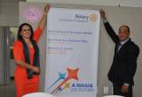 A frente de uma mesa grande, toalha azul na frente um grande símbolo do Rotary em amarelo. Da esquerda para a direita: uma mulher de blusa preta, saia preta e bege, lenço da gestão 24/25, sorrindo. Ao centro uma mulher, vestido laranja, lenço da gestão 24/25, sorrindo, ao seu lado um homem, terno, camisa azul, gravata, sorrindo, braços estivados com as mais juntas ao corpo a sua frente.