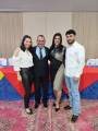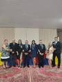 Foto com quatro casais sorridentes, eles vestindo ternos escuros com camisas claras e gravatas e elas com vestidos elegantes posam para a foto lado a lado. Atrás deles uma parede com cortinas em duas cores claras. Uma mesa retangular com toalha azul e vermelha no centro e amarela nas pontas é vista parcialmente. O teto é branco e eles estão sob tapetes estampados em vermelho.