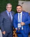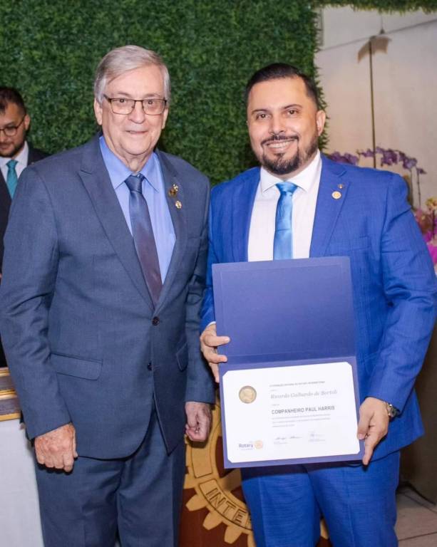 Foto com 2 homens: um senhor grisalho de óculos, terno escuro com camisa azul clara tem a seu lado um jovem rapaz de barba e bigode, usando terno azul com camisa clara e gravata também azul. Ele tem nas mãos um diploma de Rotary concedido a agraciados com título Paul Harris.
