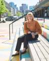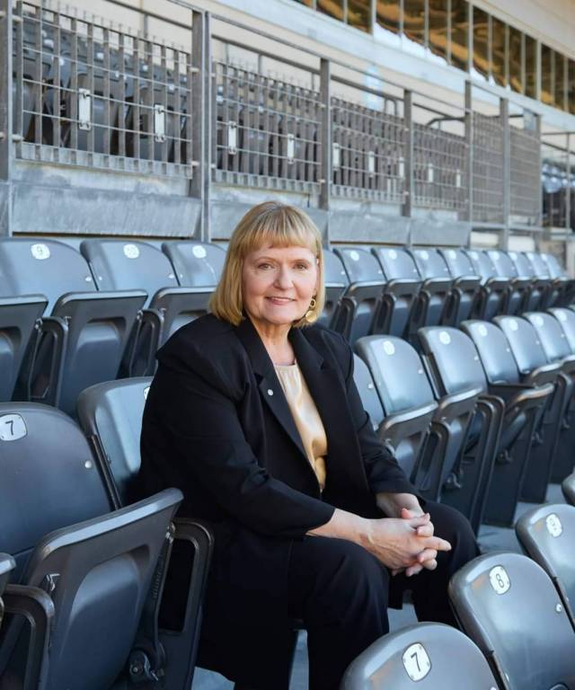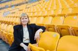 Imagem da Presidente do Rotary Internacional Stephane, sentada do lado esquerdo inferior onde o ambiente é de uma arquibancada com cadeiras amarelas. Ela sorri, está usando um blaiser e calça preta, blusa bege por baixo.
