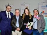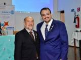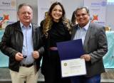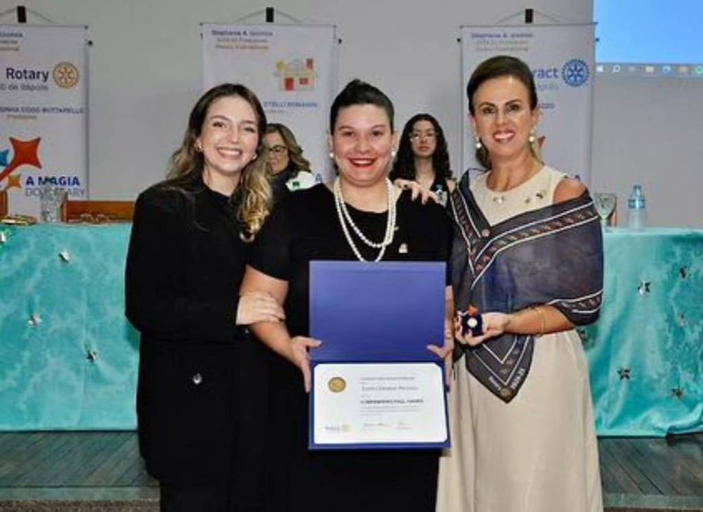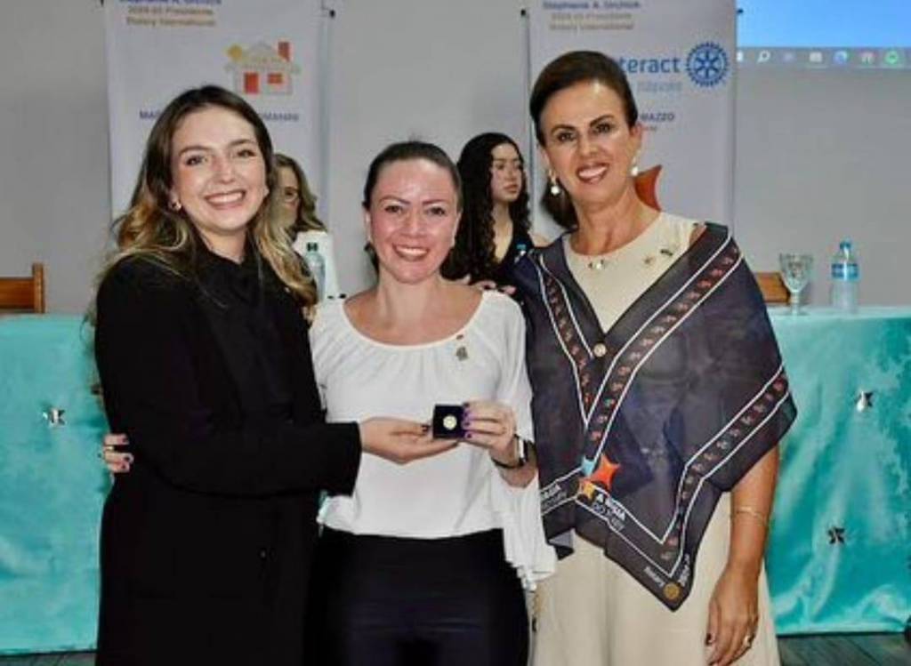 Na foto 3 pessoas identificadas: da esquerda para a direita um senhor grisalho de calça clara, camisa azul clara e jaqueta preta, ao lado dele uma jovem sorridente, loira de cabelos longos, vestindo roupa preta e faixa colorida na cintura. Na ponta direita um homem de paletó cinza escuro e camisa clara segura nas mãos um diploma rotário de capa azul marinho. O lugar aparentemente é fechado, iluminado e atrás observamos 3 grandes banners e uma grande mesa retangular com toalha verde clara.