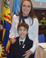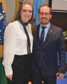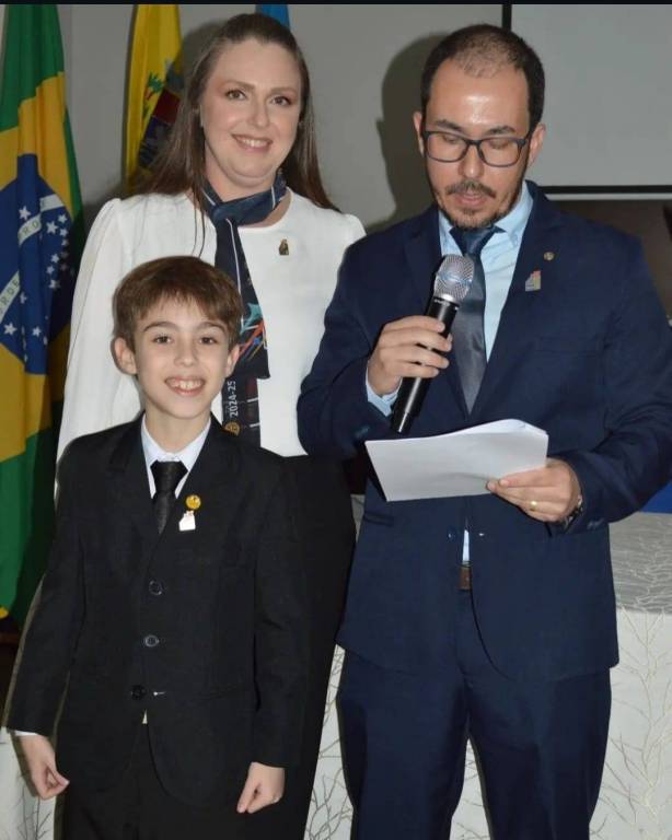 Foto de um casal sorridente, ela vestindo preto com blusa manga longa branca e lenço preto do Rotary no pescoço e ele usando óculos, com barba e bigode ralos, vestindo terno escuro com camisa azul clara e gravata também escura. Atrás deles um pavilhão com suas bandeiras deixando evidente a bandeira do Brasil no lado esquerdo. No lado direto atrás do rapaz parte de um vaso com flores e acima um telão com imagem de estrelinhas brilhantes.