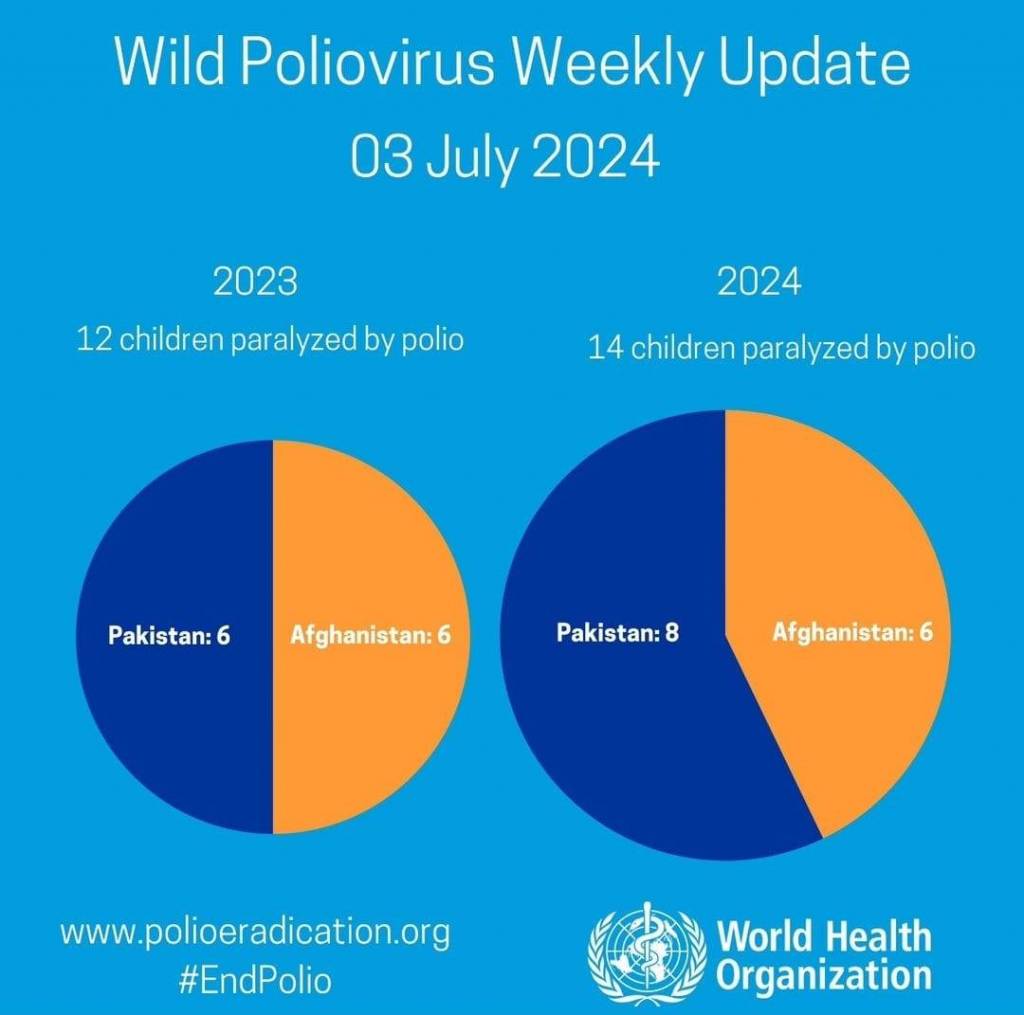 Card em azul céu trás no lado esquerdo uma esfera dividida ao meio: lado esquerdo em azul marinho escrito em branco: Pakistan: 6; e do lado direito em laranja trás os dizeres também em branco: Afganistan: 6. No lado direito uma esfera maior também dividida, no lado em azul escuro trás os dizeres em letras brancas: Pakistan: 8.E na mesma esfera maior no lado direito em laranja trás em letras brancas: Afganistan: 6. Centralizado acima em letras brancas: Wild Poliovírus Weekly Update - 03 July 2024