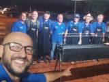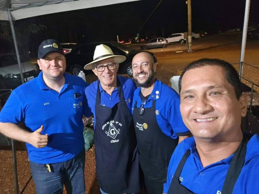 Selfie tirada por um rapaz jovem sorridente, calvo, usando óculos, de barba, posicionado à esquerda e indicando com o dedo indicador que atrás dele tem 7 homens perfilados lado a lado. Seis deles vestem camiseta azul do Rotary e 4 deles usam avental preto comprido por cima da roupa. À frente dos homens podemos observar uma grande churrasqueira de metal retangular.