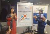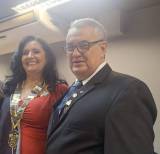 Foto de um casal sorridente, ela no lado esquerdo de cabelos longos escuro, vestindo roupa vermelha, uma peça escura sobre seu ombro direito e uma grande medalha com a roda rotária na ponta de um cordão cheio de medalhas pequenas em sua extensão. A seu lado um senhor grisalho, de óculos, usando terno cinza e camisa clara.
