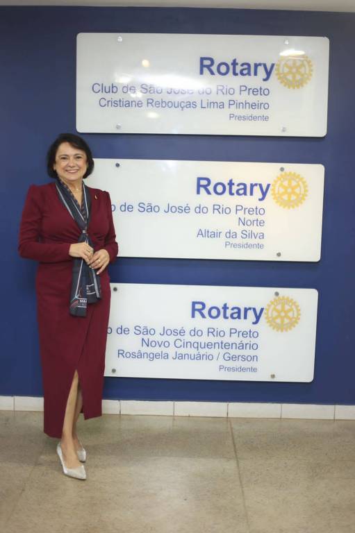 E na última placa o símbolo do Rotary Club de São José do Rio Preto Novo Cinquentenário - Rosângela Januário / Gerson - Presidente. O piso é claro. O lugar é aparentemente fechado e está iluminado.