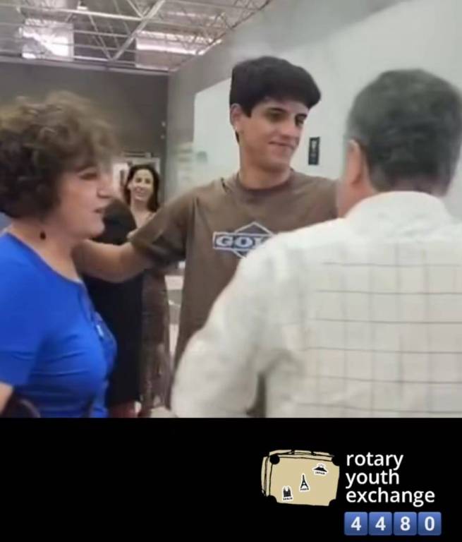 Na foto observamos uma mulher de lado com blusa azul e cabelos curtos castanho escuros, no meio um jovem com camiseta marrom, cabelos curtos preto, e de costas na frente do jovem um senhor com camisa com manga comprida amarelo claro, quadriculado. No fundo uma mulher com cabelos compridos sorrindo para eles, vestindo um vestido comprido. Estão em um saguão, com teto alto e paredes cinza. Na parte inferior da foto tem uma tarja preta, onde do lado direito observamos o logo do Rotary Youth Exchange 4480.