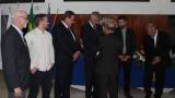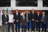 Na foto observamos um senhor com poucos cabelos vestindo terno preto, camisa branca e gravata azul, recebendo de um homem que está de costas para a câmera, com cabelos grisalhos, terno cinza escuro, um pin. Há um outro senhor com cabelos grisalhos, observando este momento, bem próximos dos dois. No fundo tem uma porta até o teto de vidro com ferragem preto e na esquerda uma parede com revestimento de madeira.