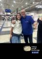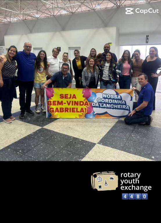 Na foto observamos uma jovem com camiseta branca com calça jeans e moleton preto. Ela está ao lado de um homem usando óculos, camiseta com gola polo azul marinho do Rotary, calça preta. ele está com o braço sobre o ombro dela. Estão posicionados para a foto. O ambiente é aberto e grande, um sagão de aeroporto, bem iluminado, com telhado de estrutura metálica e luzes acesas, com grandes pisos quadriculados.