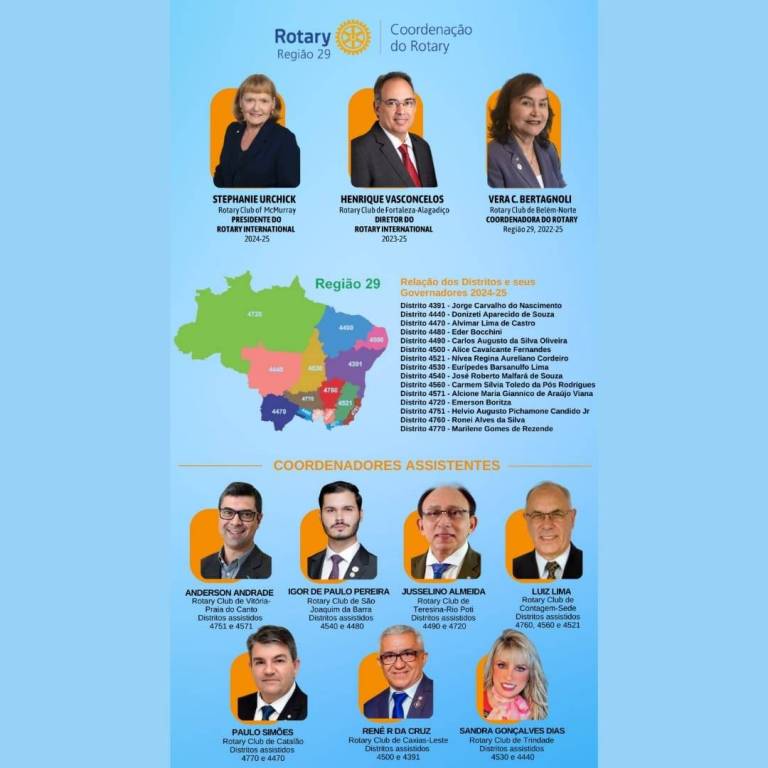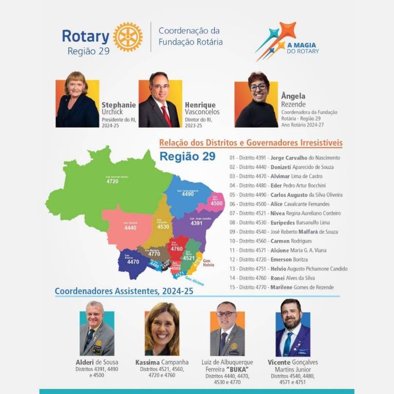 No card com fundo branco, observamos no centro escrito em roxo com letras maiúsculas: Mapa dos Distritos Assistidos Pelos Coordenadores Assistentes de Imagem Pública no Ano Rotário 2024-25. Abaixo do lado direito escrito em verde: Região 29. No centro, ocupando quase todo o espaço do card, temos um mapa do Brasil, dividido por estados com o numero do distrito e o primeiro nome do Governador dentro de cada estado. Abaixo do lado esquerdo, temos o logo colorido do Rotary Região 29 - Coordenação da Imagem Pública.