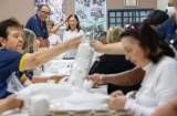Na foto observamos aproximadamente dez pessoas em volta de uma mesa, estão embalando pacotes com papel higiênico. O ambiente é fechado, com paredes beje e porta de correr de ferro com vidro. Tem dois banners pendurados na parede, com imagens diversas. A imagem está ofuscada.