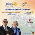 Card com fundo em tom pêssego acima e verde água abaixo, trás acima na esquerda o símbolo do Rotary Distrito 4480 e ao lado a logo da nova gestão: A Magia do Rotary. Abaixo centralizado em letras azuis: Gov. na Estrada