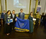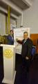 Ao fundo, há várias pessoas, incluindo uma mulher de cabelo grisalho curto e um lenço azul, um homem de uniforme militar e outras pessoas vestidas formalmente. Há também uma grande moldura de espelho na parede e, parcialmente visível à esquerda, um banner do Rotary. A decoração do ambiente inclui paredes amarelas e objetos decorativos. @Rotary4480