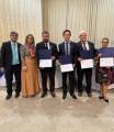 A foto mostra quatro pessoas, duas mulheres e dois homens, posando para a câmera em um ambiente fechado com uma cortina bege ao fundo. À esquerda, há um homem de óculos, cabelo grisalho e ondulado, usando um terno preto, camisa branca e uma gravata verde clara. Ao lado dele, está uma mulher com cabelo loiro e curto, vestindo uma blusa de estampa animal print de manga longa e uma saia longa bege, além de um lenço vermelho e amarelo no pescoço.