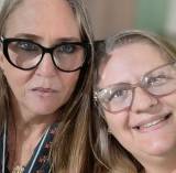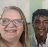 Na foto observamos da esquerda para a direita uma mulher com cabelos castanho claros, usando óculos e vestido comprido verde claro, uma mulher com cabelos castanhos claros, usando óculos, blusa beje claro com pouca estampa e calça preta, um homem com terno, camisa e gravata, um jovem com calça beje claro e camisa branca e um jovem com casaco, camiseta com gola e calça na cor preto. Todos estão sorridentes! No fundo tem um backdroop com o logo do Rotary Club de Frutal e o logo da Magia do Rotary