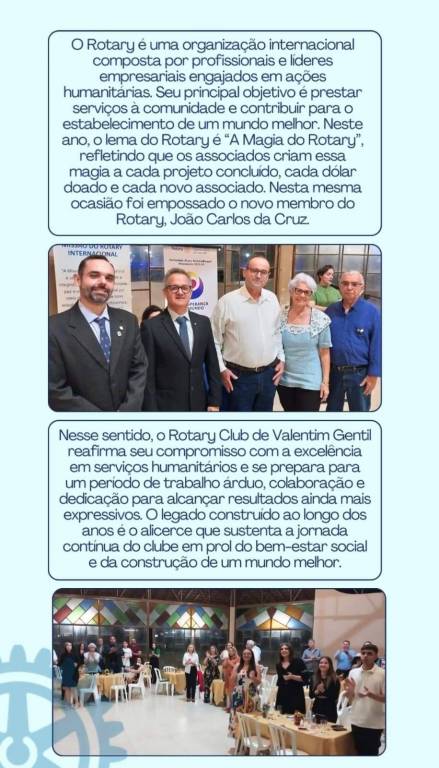 O Rotary é uma organização internacional composta por profissionais e líderes empresariais engajados em ações humanitárias. Seu principal objetivo é prestar serviços à comunidade e contribuir para o estabelecimento de um mundo melhor. Neste ano, o lema do Rotary é “A Magia do Rotary”, refletindo que os associados criam essa magia a cada projeto concluído, cada dólar doado e cada novo associado. Nesta mesma ocasião foi empossado o novo membro do Rotary, João Carlos da Cruz.