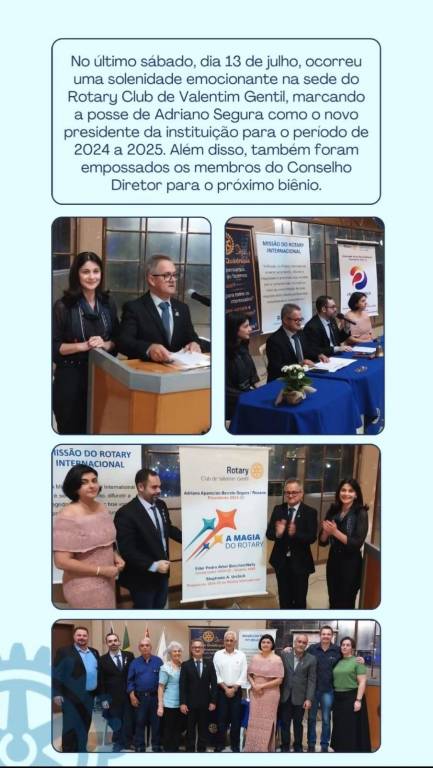No último sábado, dia 13 de julho, ocorreu uma solenidade emocionante na sede do Rotary Club de Valentim Gentil, marcando a posse de Adriano Segura como o novo Pres. da instituição para o período de 2024 a 2025. Além disso, também foram empossados os membros do Conselho Diretor desta próxima gestão.