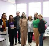 Na foto perfilados lado a lado e sorrindo, temos: seis mulheres e um rapaz vestidos com peças de inverno. A segunda mulher da esquerda para a direita segura nas mãos o que parece ser um panfleto colorido. O lugar é fechado, tem paredes em lilás na lateral e ao fundo, onde observamos também 3 grandes aberturas de vidro por onde passa uma grande claridade vinda de fora. Na lateral esquerda acima temos parte de uma aparelho de ar condicionado. Observamos alguns móveis no local, como: parte de poltronas vermelhas atrás das pessoas, parte de mesinha e parte de uma bancada na lateral direita.