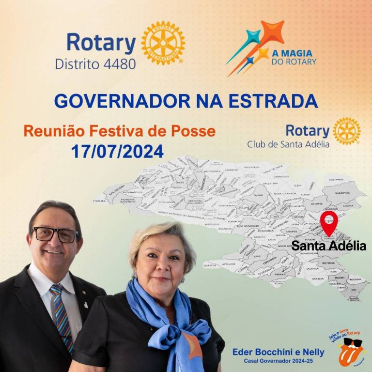 Abaixo em vermelho lado esquerdo Reunião Festiva de Posse e abaixo em azul 17/07/2024. Ao lado direito o símbolo do Rotary Club de Santa Adélia. Abaixo um mapa do distrito com um marcador em vermelho em cima da cidade de Santa Adélia. No lado esquerdo abaixo a foto do casal gov., ele de terno preto, camisa branca, gravata, usando óculos e sorrindo; ela de vestido preto, lenço azul. No rodapé lado direito: Éder Bocchini e Nelly - casal Gov. 2024-25. Ao lado a foto de uma boca aberta onde aparece a língua para fora, de óculos escuros, ao redor na parte de cima escrito: Seja o bem, acima e vindo ao Rotary abaixo. E terminando ao lado da língua a palavra Irresistível.