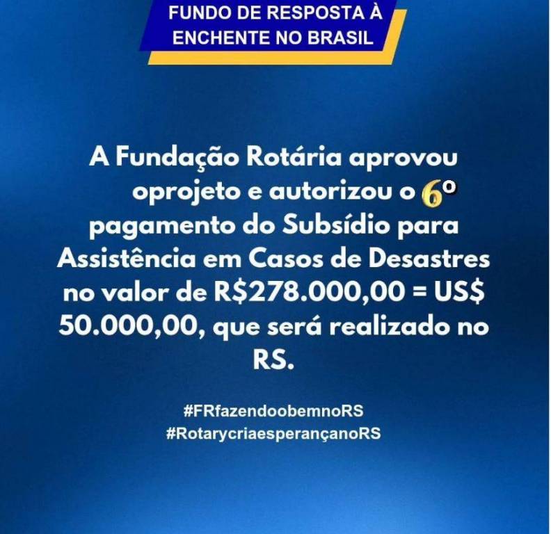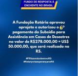 Fundo de Resposta À Enchente no Brasil. Bem no centro do card em letras brancas: A Fundação Rotária aprovou o projeto e autorizou o 6° pagamento do Subsídio para Assistência em Casos de Desastres no valor de R$ 278.000,00 = US$ 50.000,00, que será realizado no RS.