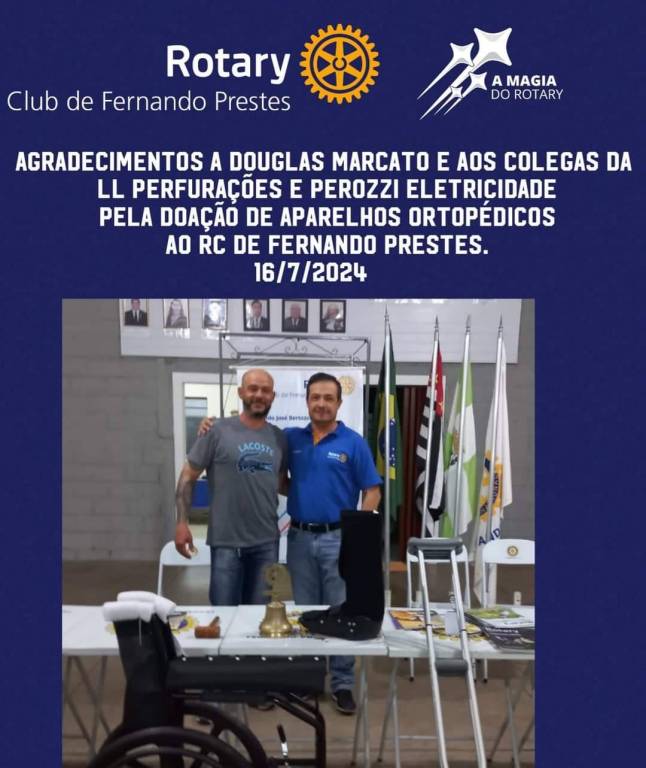Esteve presente o Sr. Douglas Marcato que, no final da reunião, entregou uma cadeira de rodas, uma bota ortopédica e um par de muletas para o Banco de Aparelhos Ortopédicos do clube.