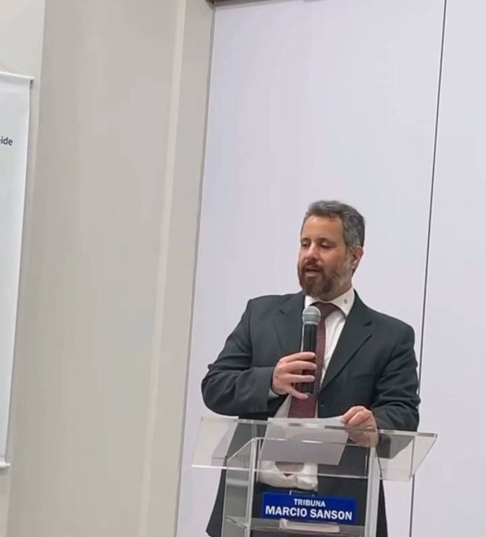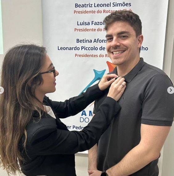 Na parede do fundo que é clara observamos uma imagem refletida que tem no seu conteúdo logos de três gestões passadas de Rotary e ao lado um banner rotário com fundo branco da nova gestão. O lugar é fechado, está iluminado e o piso também é claro.