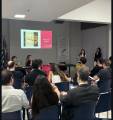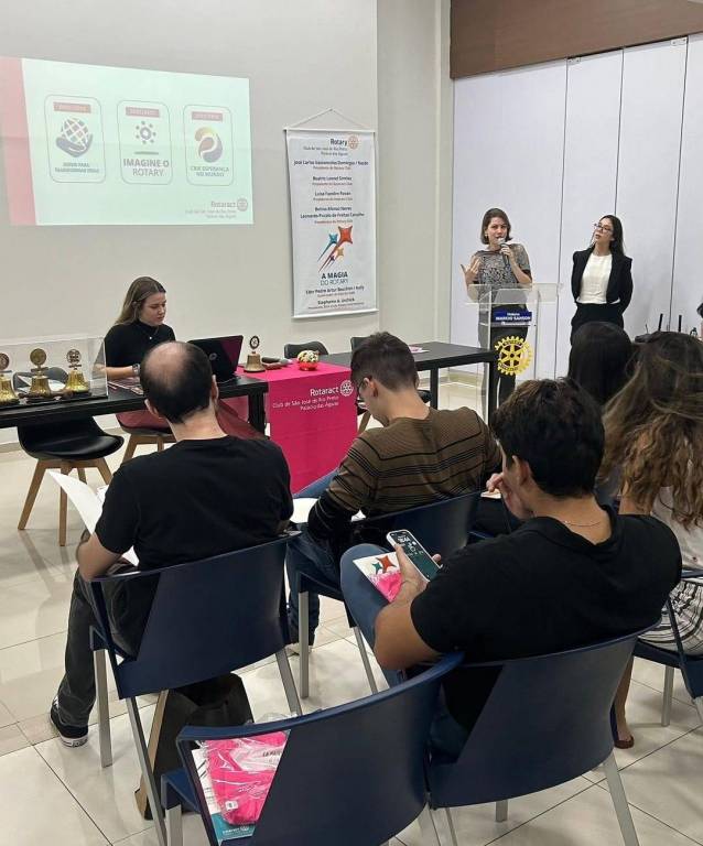 A foto foi feita do fundo para a frente de uma sala com pessoas sentadas em cadeiras pretas, onde a maioria está com celular nas mãos. De frente para estas pessoas que estão sentadas temos uma mesa retangular escura com uma toalha pink estreita no centro, que trás sobre ela um porquinho de louça dourado, um microfone, um sino e seu martelo rotário. A toalha trás o símbolo em branco do Rotaract Club de São José do Rio Preto Palácio das Águas. No lado esquerdo dessa faixa observamos uma jovem de cabelos longos, vestindo preto, sentada usando um notebook. Nesta mesa no canto esquerdo dentro de uma redoma de vidro temos 3 sinos rotários. No lado direto de pé 2 jovens, uma está com o microfone nas mãos discursando atrás de uma tribuna de acrílico com a roda rotária em amarelo bem na frente. Ao lado dela uma jovem de óculos, calça preta com blusa branca e paletó preto a observa.