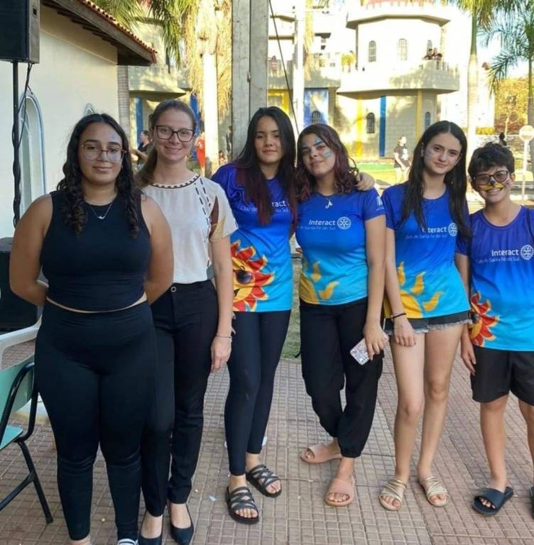 Na foto 6 jovens, sendo 5 meninas e um menino. As duas primeiras jovens no lado esquerdo usam óculos e estão vestidas de maneira esporte e o restante dos adolescentes vestem camisetas azuis iguais do Interact.