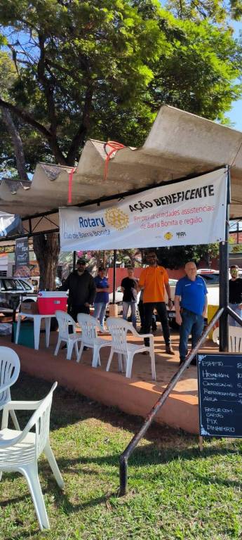 Foto de um dia de sol claro, sob uma estrutura de telhas de cinco brancas grandes com ferros nas laterais, observamos algumas pessoas ao lado de cadeiras de plástico brancas, uma mesinha plástica branca com uma caixa térmica vermelha sobre ela também está na cena. Como o lugar é aberto observamos também uma grande árvore próxima às pessoas, carros estacionados e presa nas laterais da estrutura temos acima uma grande faixa branca com: o símbolo do Rotary Club de Barra Bonita e ao lado em letras grandes pretas Ação Beneficente. Abaixo em letrinhas menores e vermelhas temos: Em prol de entidades assistenciais de Barra Bonita e Região. Encostada em um ferro na lateral direita abaixo temos uma lousa preta com informações do que estão vendendo ali escritas em branco. O chão é de gramado e toda a estrutura descrita acima está a um degrau acima em um cimentado.