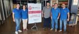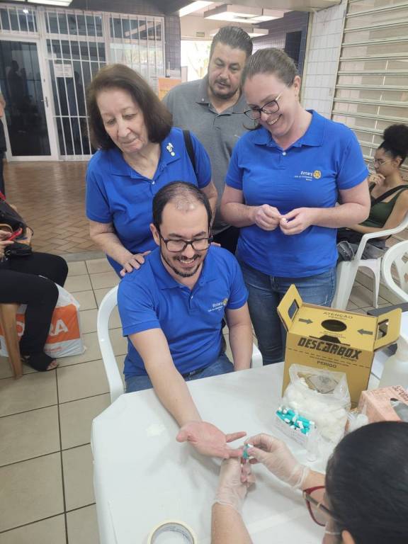 Na foto observamos um ambiente aberto, com um jovem sentado numa cadeira branca, mesa branca, com uma caixa de descartes sobre a mesa e também algumas agulhas descartáveis. Ele está com o braço estendido para a retirada do sangue. Atrás dele olhando para o braço do jovem, temos duas mulheres que estão de pé, com camiseta gola polo azul, com logo colorida do Rotary Club de Catanduva - Norte. Atrás delas também olhando para o ato da coleta, um homem com bigode e barba cerrada, camiseta com gola polo na cor cinza. Nas laterais da imagem tem pessoas sentadas aguardando atendimento. O ambiente tem portas com grades brancas, e piso em tons claros.