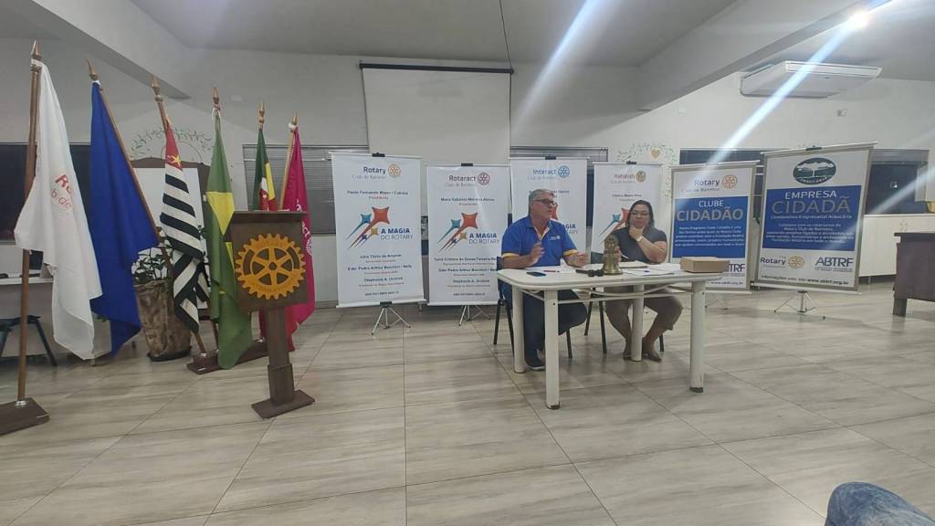 Duas pessoas identificadas na foto: da esquerda para a direita sentados em cadeiras de ferro apoiados em uma mesa retangular pequena branca, temos um homem grisalho olhando para o lado, usando óculos e camiseta azul de frisos amarelos do Rotary e ao seu lado uma mulher também de óculos usando blusa preta manuseando algumas folhas de papel que estão sobre a mesa. Sobre a mesa também temos um sino rotário e o martelo de madeira, um celular e uma caixa pequena de papelão. Atrás deles temos cerca de quatro banner rotários: da esquerda para a direita banner do Rotaract Club de Barretos, Interact Club de Barretos , Rotakids Club de Barretos e banner de Clube Cidadão do Rotary Club de Barretos. O lugar é fechado, está iluminado, tem paredes brancas ao fundo com vidraças e o piso é bege matizado.